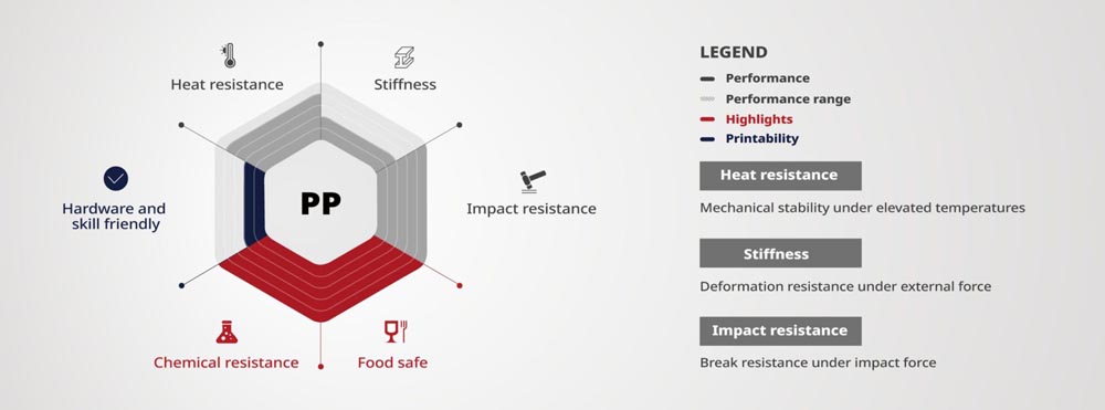 PP is a thermoplastic 3D printing filament and as well as being commonly used in daily life. PP filament is durable, break-resistant, fatigue-resistant, and semi-flexible. Parts that are 3D printed in PP are well-suited for uses that involve twisting, flexing, or bending. PP is also a contact-safe material for food, chemical, and medical applications, including orthopedic use due to its lightweight and low friction characteristics.