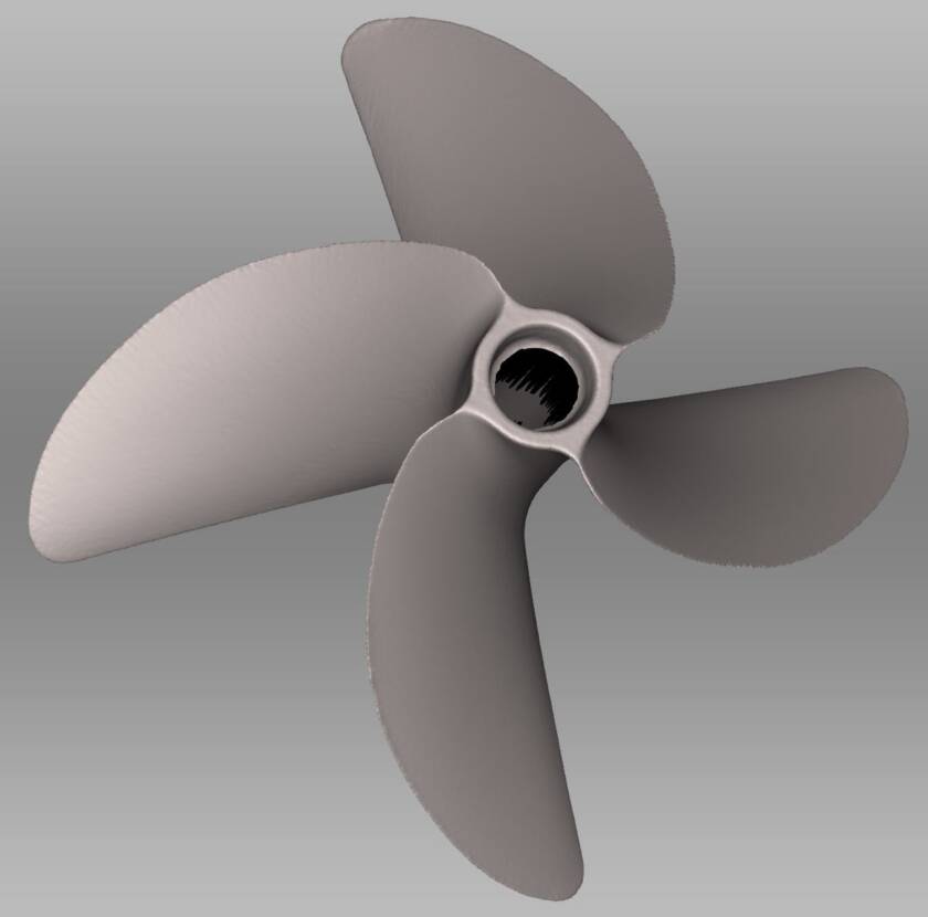 This is a custom machined boat propeller which the manufacturer was contracted to duplicate. In order to do so, they needed an accurate model of the prop with which to machine a replacement. Using the Artec Eva, the propeller was fully captured and rendered in very high resolution for conversion to CAD. Note that the blade edges appear ‘ragged’. This is due to 3D scanners have a great deal of difficulty capturing very fine edges. However, there is more enough detail in the scan to create a perfect recreation in CAD.