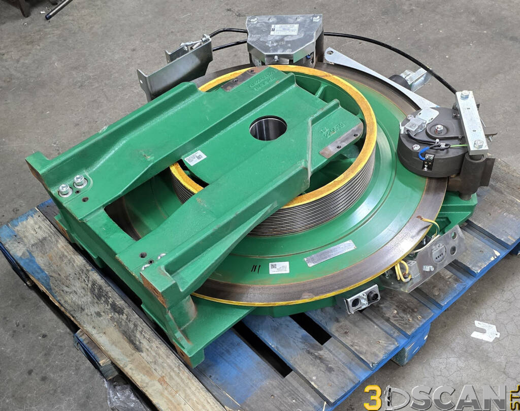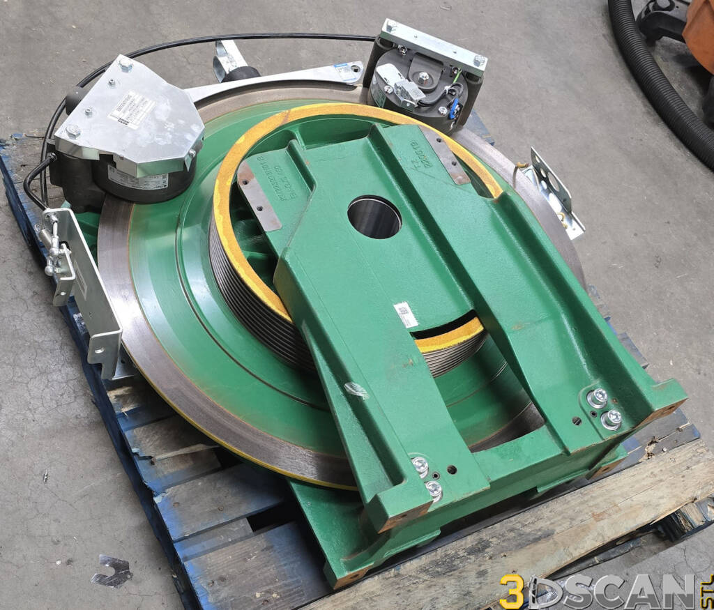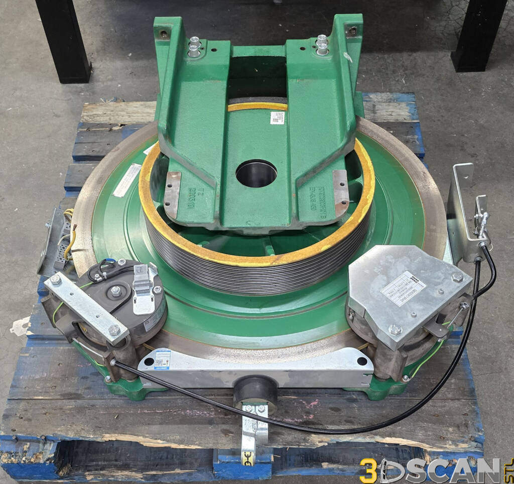 Sketchfab codeWe were contracted again by Hollister-Whitney to scan a couple of elevator motor units at their facility in Quincy, Illinois. These were very large and very heavy assemblies. It took about an hour each to scan them both and a little bit more time to capture the brackets as well. This unit weighs over 2000lbs, but was somewhat easier to scan than the MX20. The objective was to capture the major dimensional data for use when designing the framework for mounting of this motor.