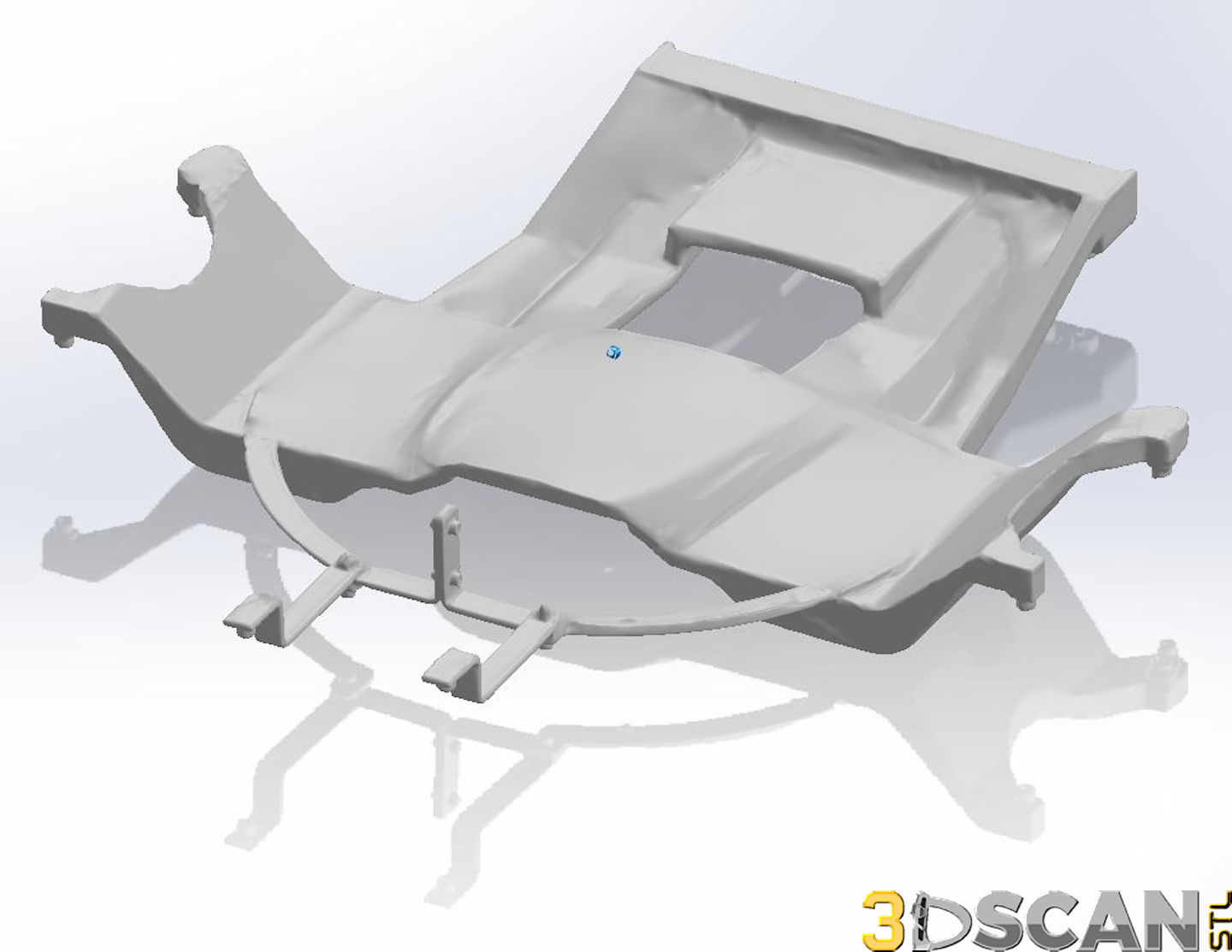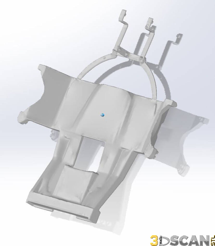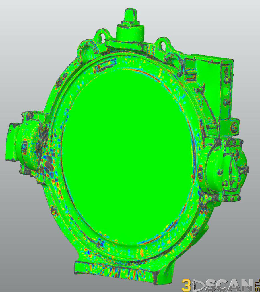 Below are the results of the conversion to a solid CAD object. On the left is the surface wrap converting the mesh into a solid object. On the right is the deviation analysis showing the tiny areas in which the surface wrap does not ‘touch’ the mesh surface perfectly. As you can see, the tiny areas of deviation are incredibly minor and do not pose any challenges for the engineers who use this for their design work.