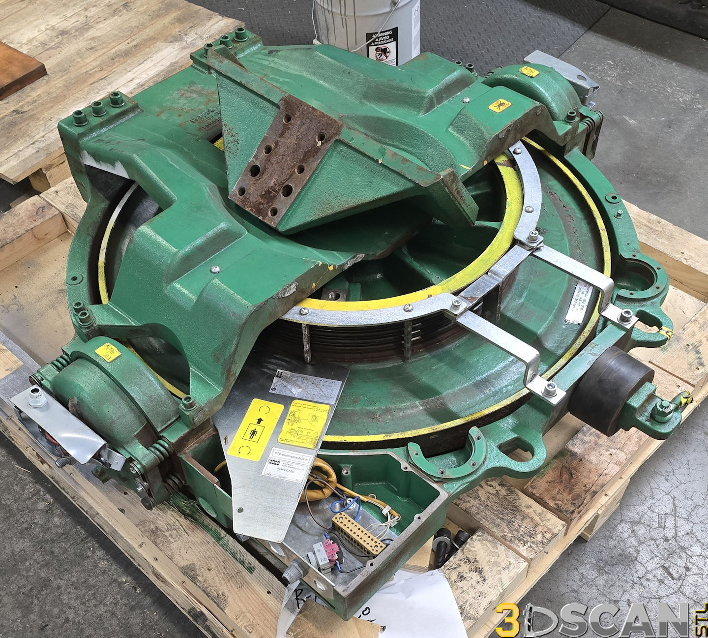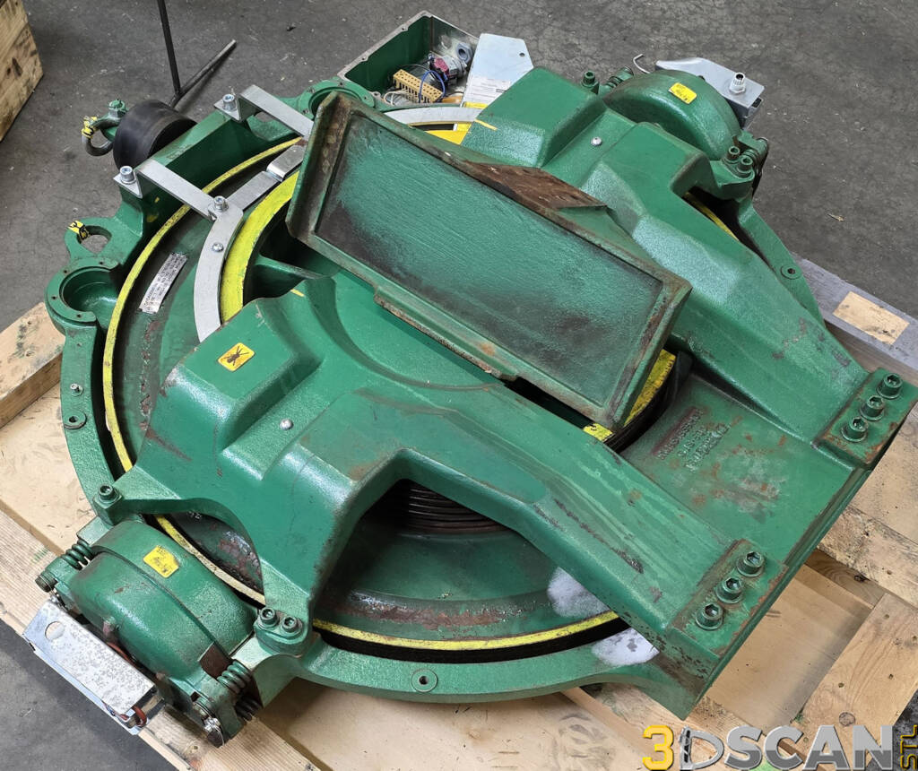 We were contracted again by Hollister-Whitney to scan a couple of elevator motor units at their facility in Quincy, Illinois. These were very large and very heavy assemblies. It took about an hour each to scan them both and a little bit more time to capture the brackets as well. This unit weighs over 2500lbs and posed some challenges with scanning. The objective was to capture the major dimensional data for use when designing the framework for mounting of this monster.