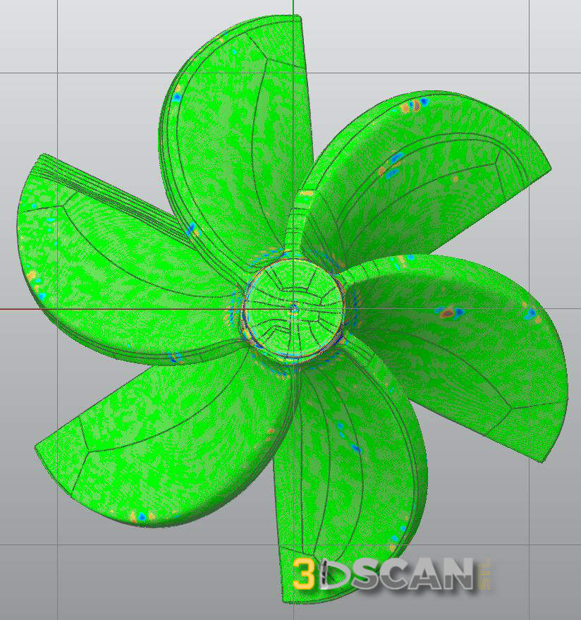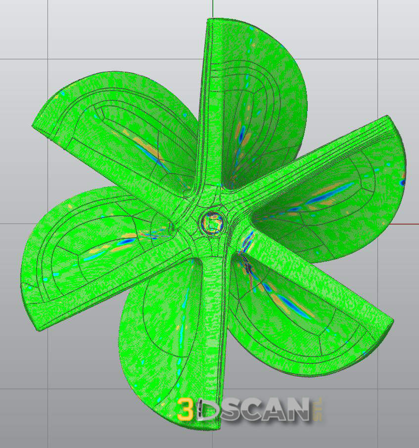 Herring Propeller brought us another prop for which they needed a highly accurate solid model to use for reproduction. This is a stock, non-milled, ix blade propeller. Scanned with the Artec Eva in high resolution, it was captured and converted to a solid model with precision detail. The bottom images show the deviation maps of the object after conversion. The results speak for themselves. Thank you to Herring Propeller for your continued patronage.