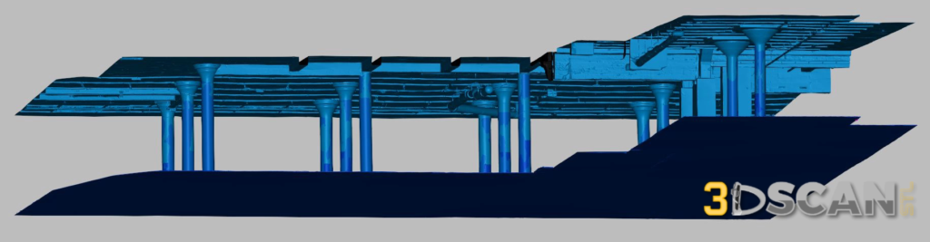 The scanning process was about 3 hours to capture the entire space which was 6,600 square feet. While the only data they required was a deviation analysis of the floor, the Laser/Lidar 3D scanner (TLS) captures everything. The model shown above is the complete model of the space. From floor to ceiling, every detail is captured.