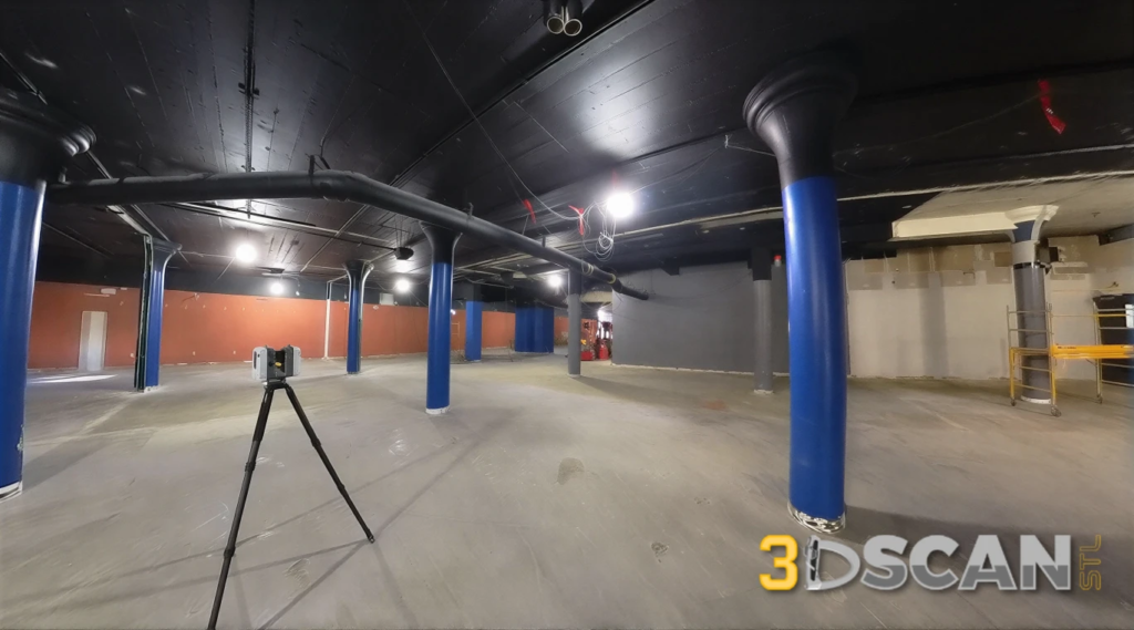 Because the focus was only the floor, the scans were performed in the center of each set of pillars. So the ceilings details are not as clean as they would be if we were scanning in a tighter grid pattern. Even without focusing on the details above, a tremendous amount of detail is still captured well.