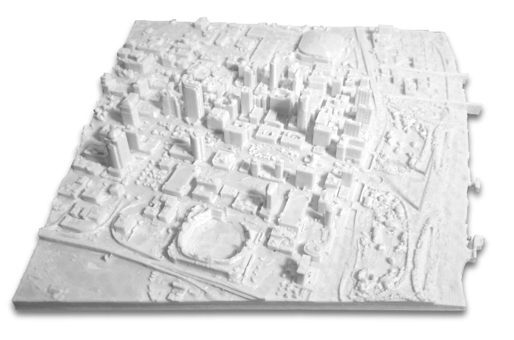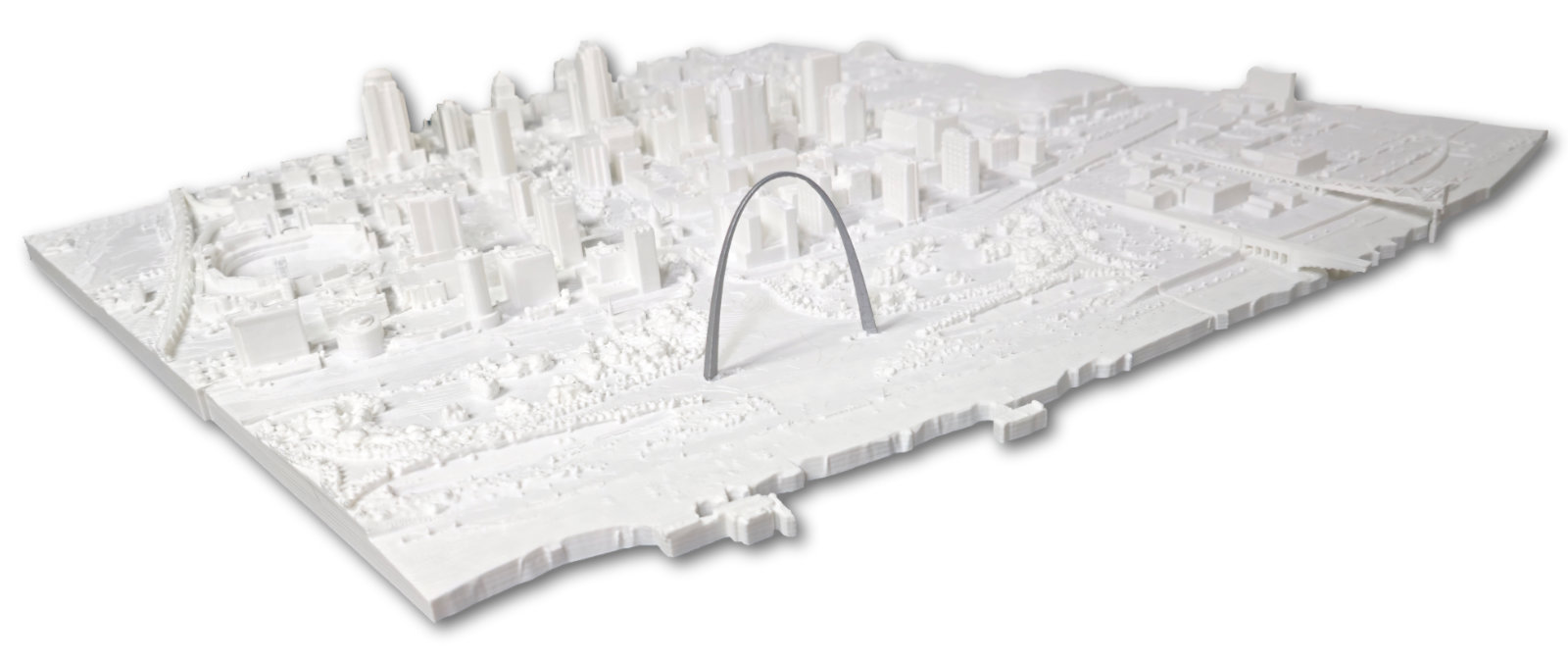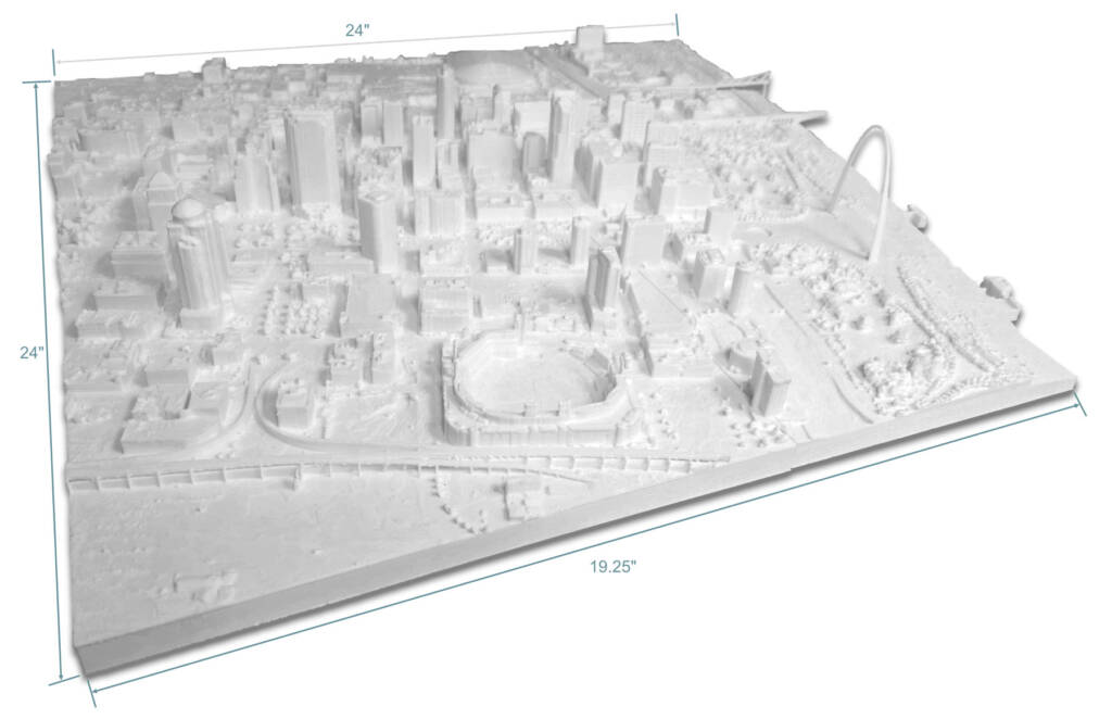 Just in time for Christmas. Give the gift of St. Louis. Printed in 3D, this relief of the city of Saint Louis is highly detailed and showcases several well known landmarks. Some of which include the Arch (obviously), Busch Stadium, The Dome at America’s Center, the historic Old Courthouse building, Thomas F. Eagleton Courthouse, Mercantile Bank building, Railway Exchange building, Missouri Pacific (MOPAC) Headquarters building, Eads Bridge and Terminal Railroad Association (TRRA) along the waterfront.